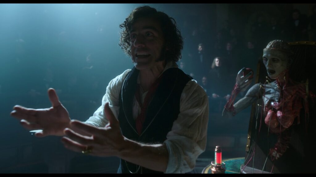 O filme é visualmente impecável. Dos cenários ao figurino, tudo é hipnotizante. Realmente o trabalho de direção de produção, figurino e efeitos são impressionantes. É tanta exuberância que até o gore fica bonito e é aí que a versão de Guillermo del Toro para FRANKENSTEIN se mostra não tão cabulosa como o esperado – ou prometido por sua filmografia? – pois, na medida que o filme avança, a trama não aprofunda, fica redundante e estaciona no lugar comum de um filme apenas lindo.